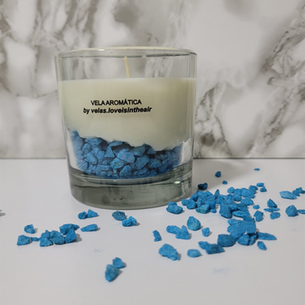 Elaborada con cera de soja natural y una base de piedras decorativas que le aportan un toque artesanal y elegante. Su aroma es a elección, permitiéndote personalizarla según tu gusto o el ambiente que quieras crear. Ideal para regalar o disfrutar en tus momentos de relax.