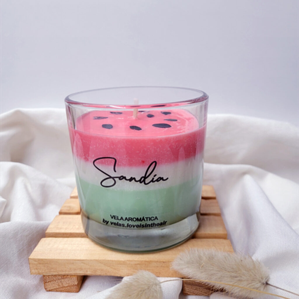 Hecha con cera de soja natural y aroma a sandía. Su fragancia fresca y frutal evoca el verano, llenando tus espacios de alegría y vitalidad. Ideal para dar un toque colorido y perfumado a tu hogar.